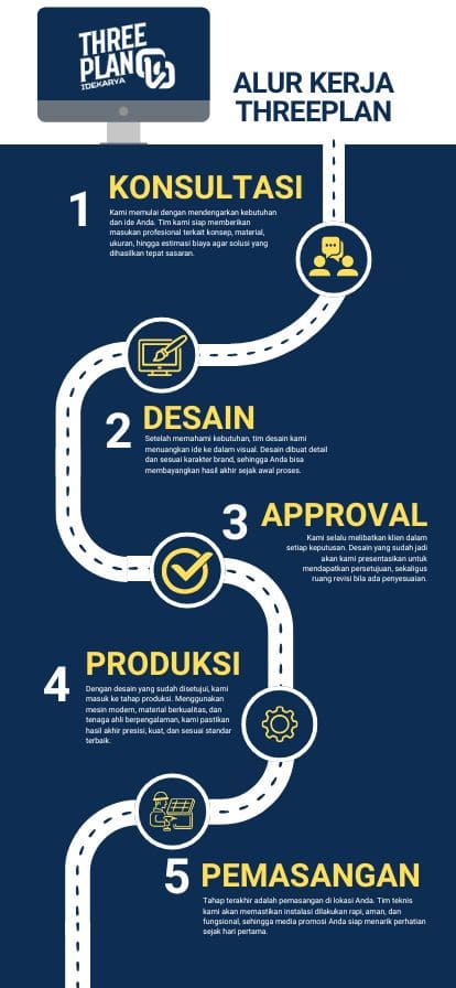 PT Threeplan Idekarya adalah perusahaan yang bergerak di bidang jasa pembuatan media promosi visual sejak tahun 2015. Kami menghadirkan solusi lengkap untuk kebutuhan branding dan identitas bisnis melalui produk-produk seperti neonbox, reklame, billboard, huruf timbul, neonflex, rambu pabrik, hingga plang nama.